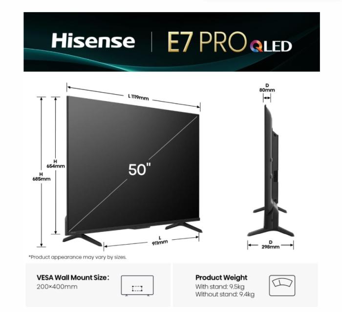 Телевизор Hisense 50' E7Q Pro, 4K Ultra HD 3840x2160, QLED, Quantum Dot, 144Hz, HDR 10+ adaptive, HLG, Dolby Vision, DTS Virtual X, Smart TV, WiFi 5GHz, WiFi Direct, BT, Anyview Cast, 3xHDMI, 2xUSB, LAN, CI+, DVB-T2/C/S2, Black