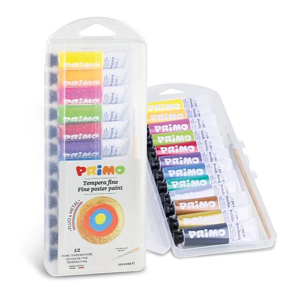Primo ви представя 12 неотразими цвята темперни бои, с които да озарите всяка ваша картина. Внесете собствен стил във вашите творения с комбинацията от неонови и метални цветове. Алуминиевите тубички са лесни за използване, а кутията, в която се намират, ви позволява да ги вземете навсякъде, за да ги покажете на вашите приятели.