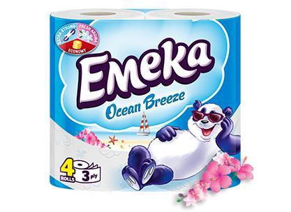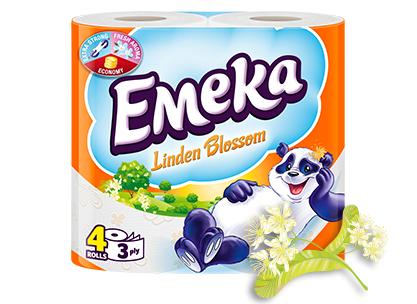 Тоалетната хартия Emeka е за хората, които харесват свежестта на нежното лятно ухание, носещо се от цъфналия липов цвят. Тоалетната хартия на Емека е супер здрава, което я прави икономична, а свежият аромат и меката на допир тестура позволяват използването ѝ дори и от хора с чувствителна кожа. Продуктът е изработен от 100% целулозен материал, съчетан с превъзходна мекота, искряща белота и цветни мотиви.