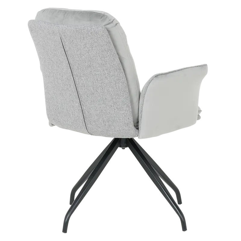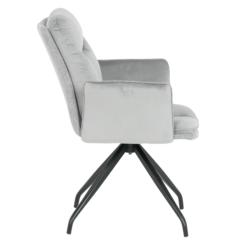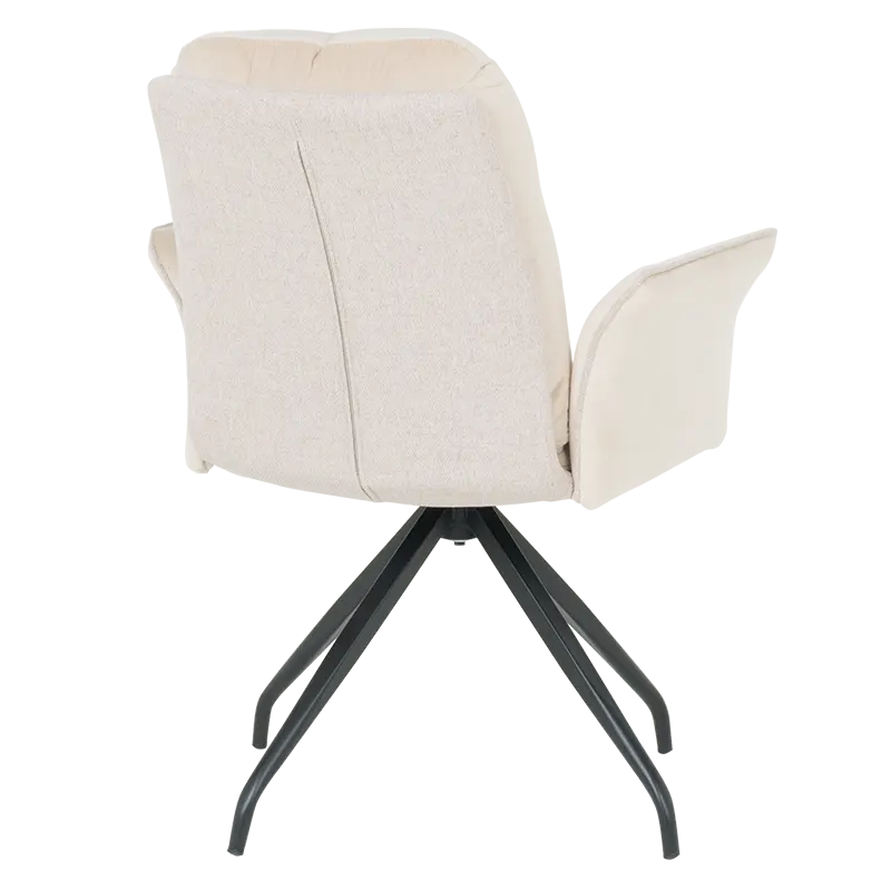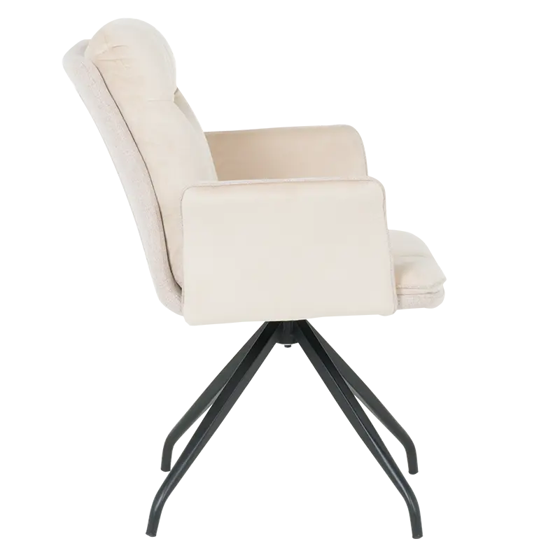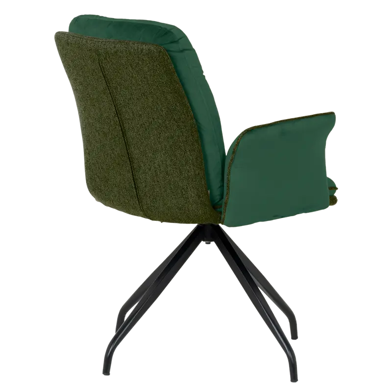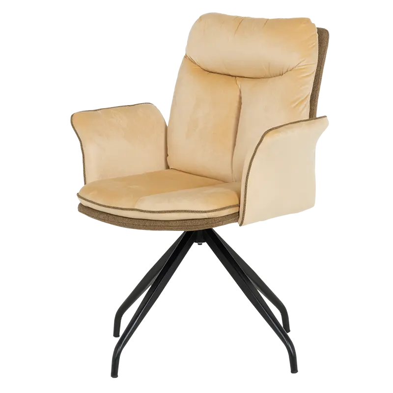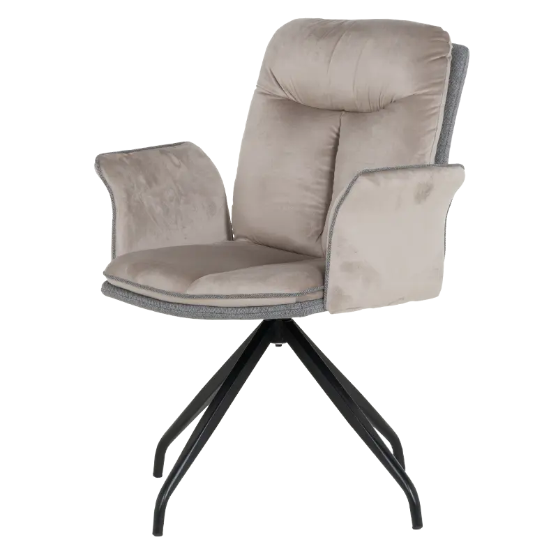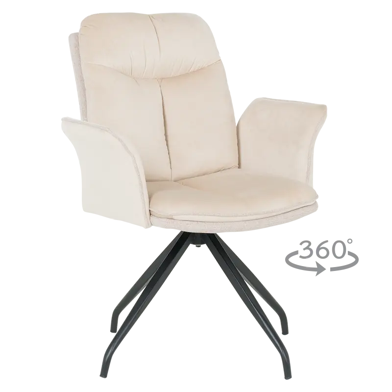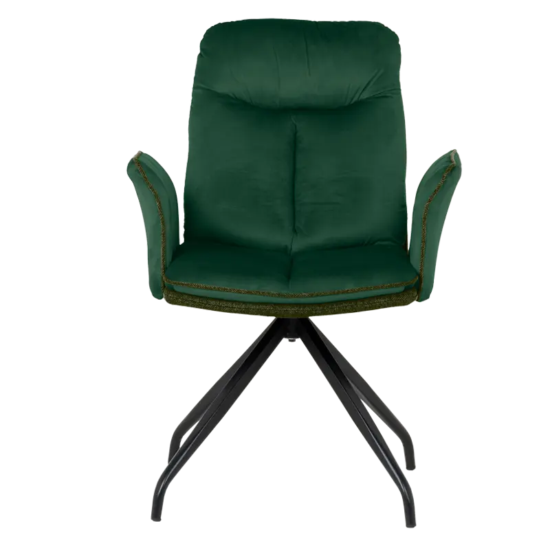 Трапезен стол КРАСЕН е трапезен стол с модерна визия. Той има широки седалка и облегалка от дамаска, с допълнителни възглавници за максимално удобство. Подлакътниците повишават комфорта на седящия. Основата е метална и има иновативна функция за 360° въртене.