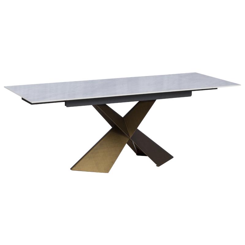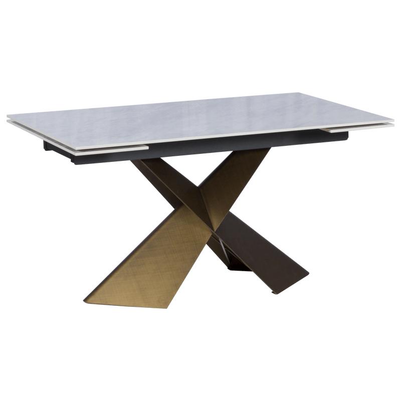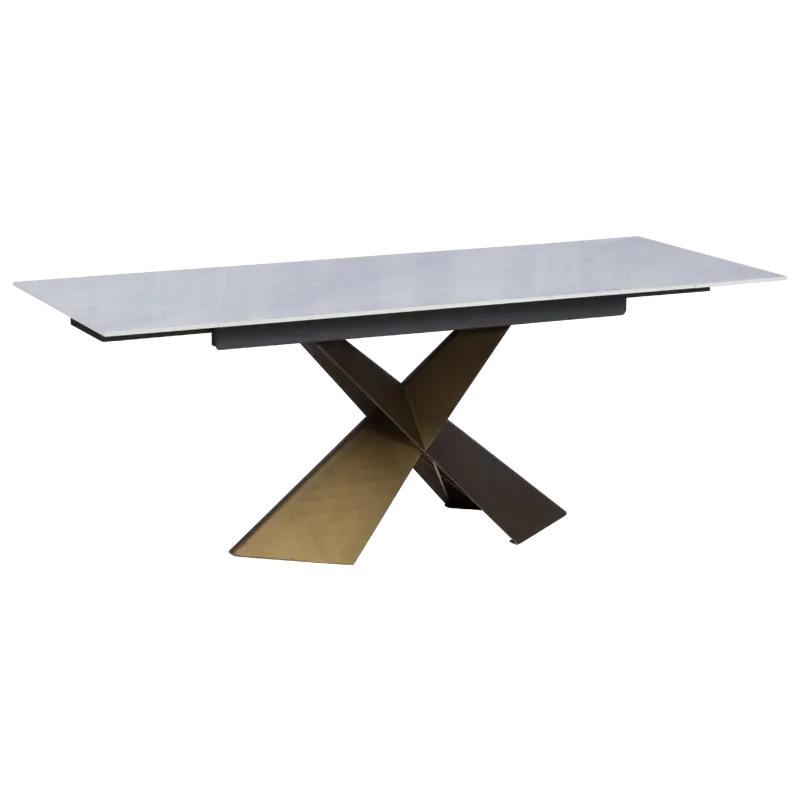 ЛЕОНА е модерна трапезна маса с масивна и нестандартна основа, изработени от праховобоядисан метал. Тя е с керамичен плот, с интересни шарки, а благодарение на механизма за разтягане ще имате повече място на трапезата, когато посрещате гости.