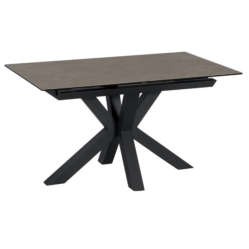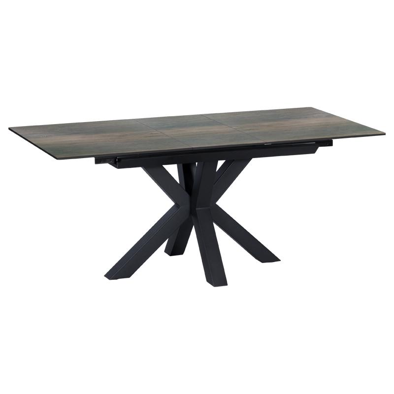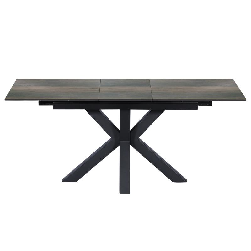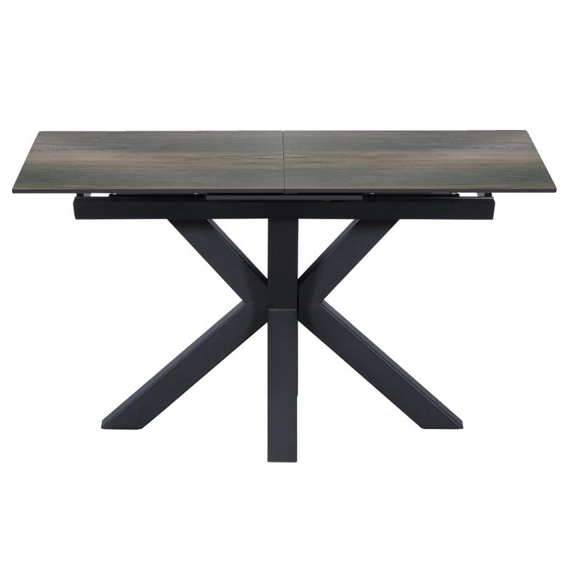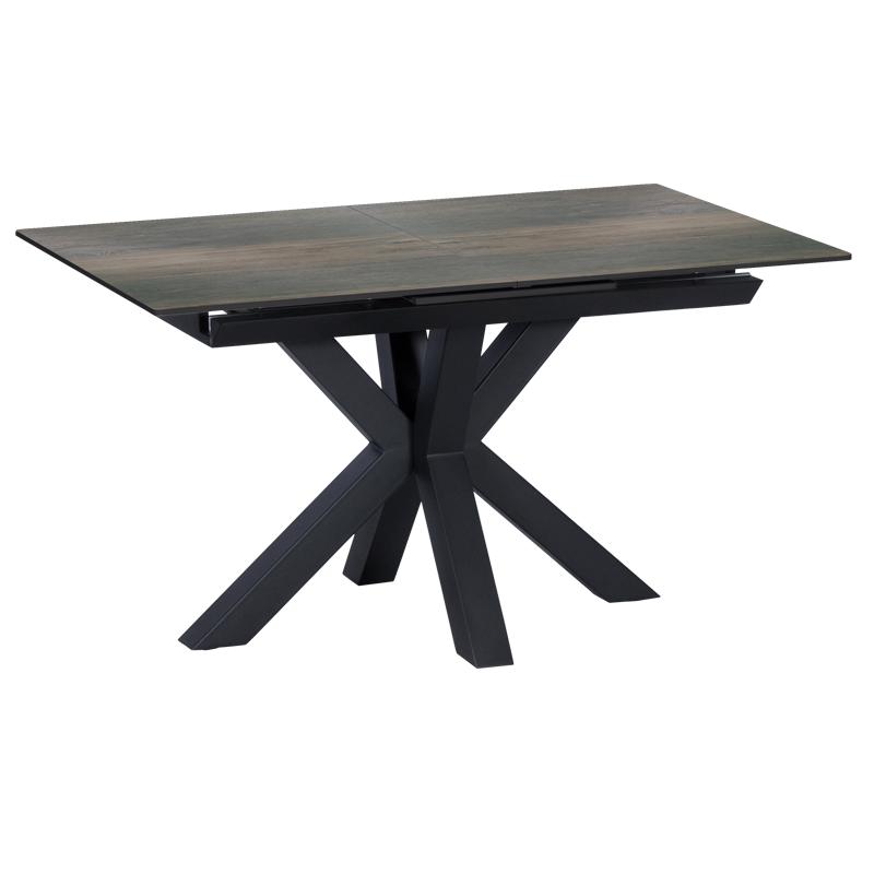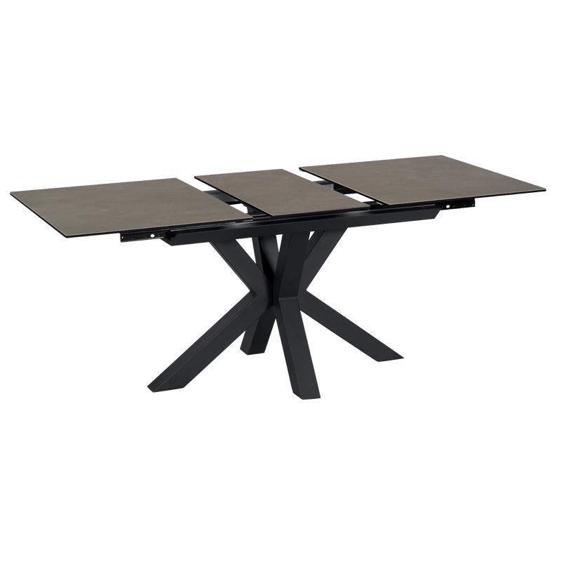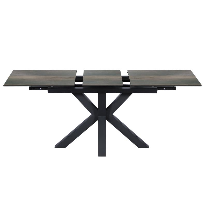 Трапезната маса ЛИДИЯ е модерна с масивни и нестандартни крака, изработени от праховобоядисан метал. Тя e с правоъгълен керамичен плот и практична функция за разтягане.