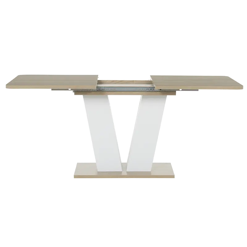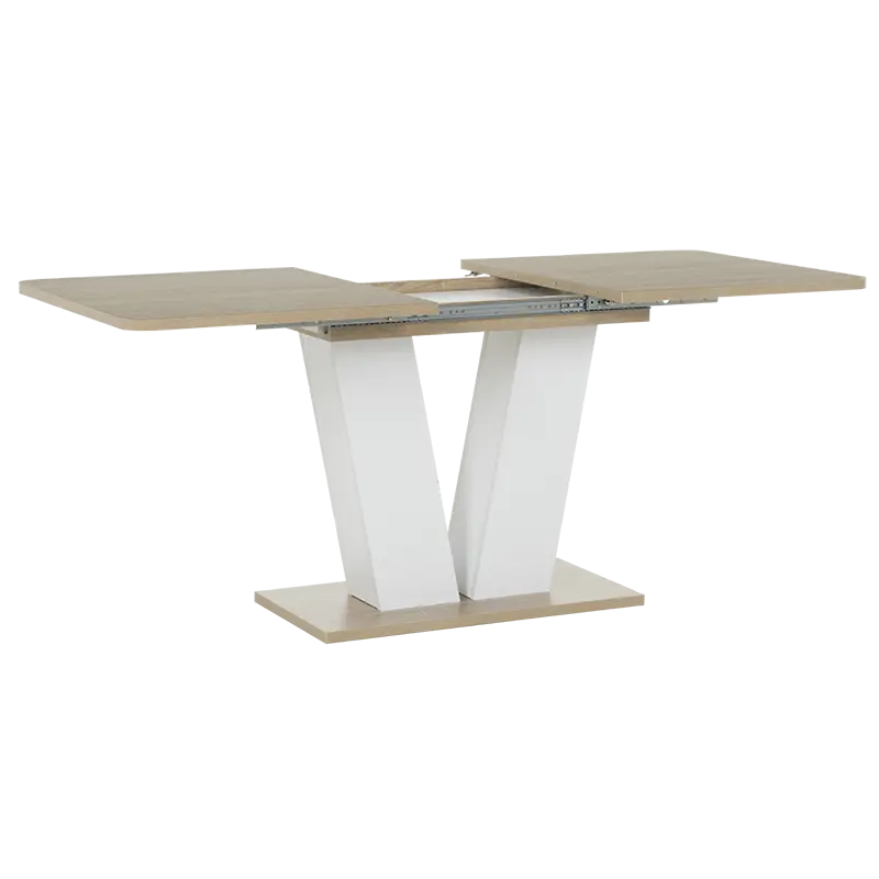 Трапезна маса ВЕГАС е модел с модерен дизайн, който ще допълни идеално всяка съвременна кухня. Масата е със стандартна височина от 75 см и нестандартна V-образна основа. Плотът е с дебелина 25 мм и размери 136х80 см, като с помощта на допълнителна плоскост може да разтегнете масата, при което дължината на плота се увеличава на 176 см.