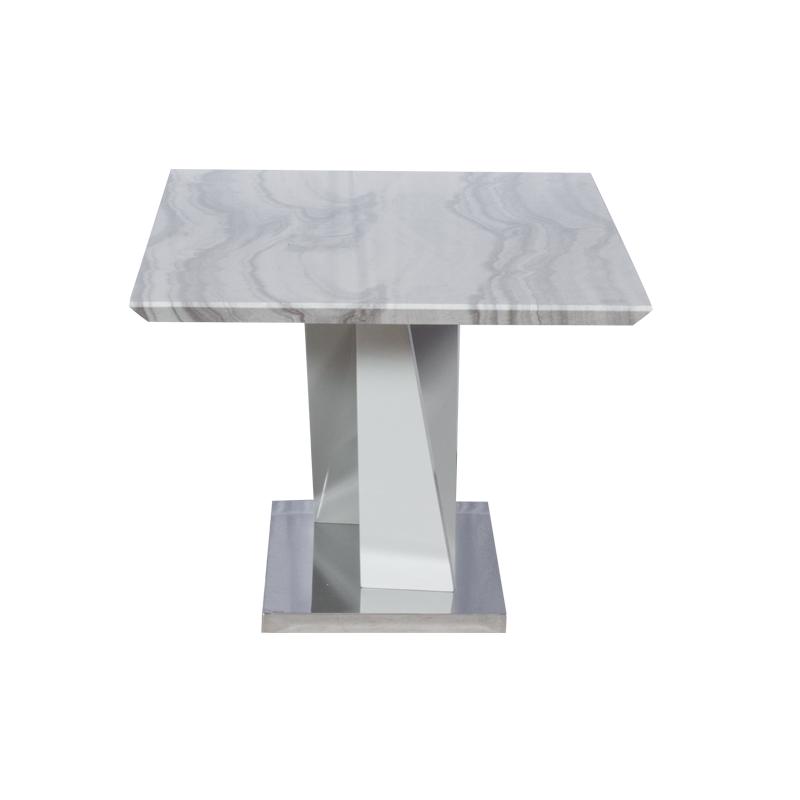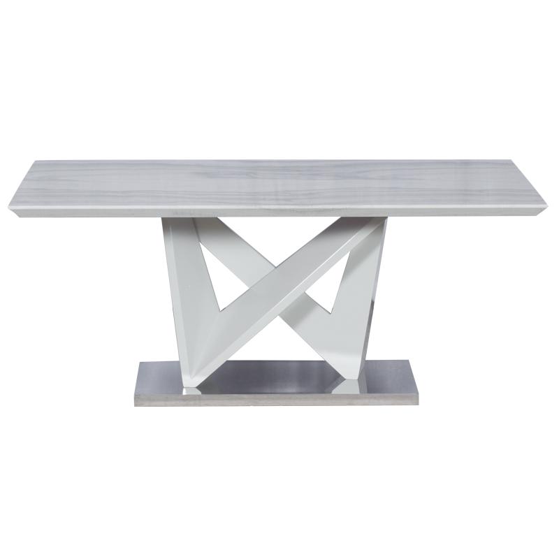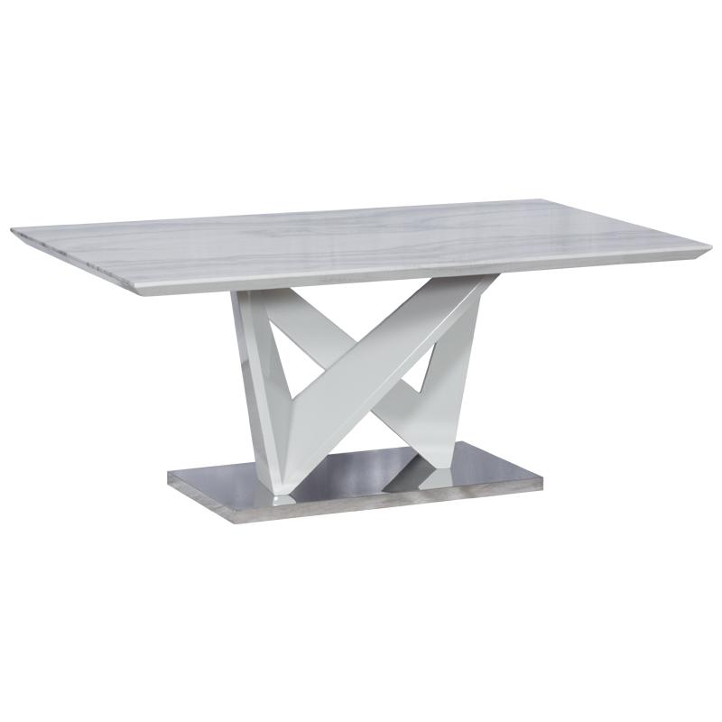 Трапезната маса ВЕРЖИ е масивна с оригинален и стилен дизайн. Моделът е с голям плот с размери 180х100 см., който е изработен от МДФ материал с покритие в мраморен цвят. Интересната основа с необичайна форма също е направена от МДФ, а в долната част от неръждаема стомана.