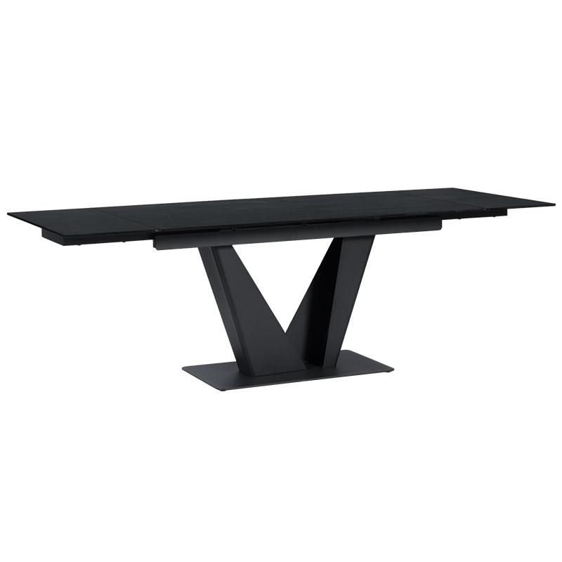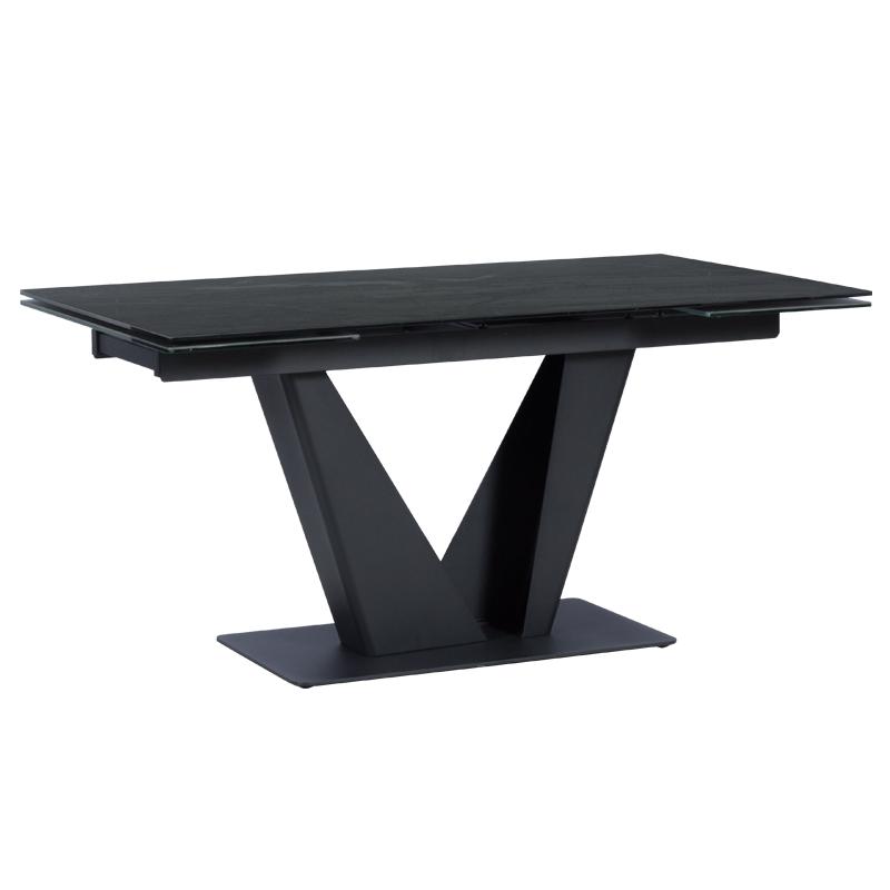 Трапезната маса ЯНА е с функция за разтягане и модерна визия. Интересната основа на модела е изработена от устойчив праховобоядисан метал. Плотът е комбинация от керамика и закалено стъкло, с дебелина 10 мм и размери 160х90 см в стандартно положение и 240х90 см при разтягане.