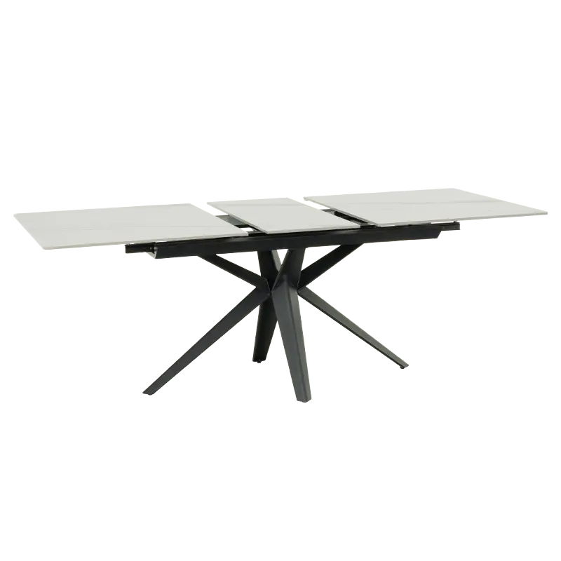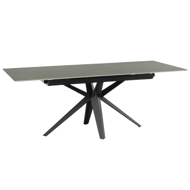 Трапезната маса ЗОРИ е с удобен разтегателен механизъм. Стилният ѝ дизайн я превръща в страхотен акцент за всеки дом. Керамичният плот е с дебелина 12 мм и със стандартен размер от 140 см, а при разтягане се удължава до 200 см. Така всеки гост или член на семейството ви ще се чувства комфортно. Разчупената метална основа осигурява стабилност и дълга експлоатация на масата.