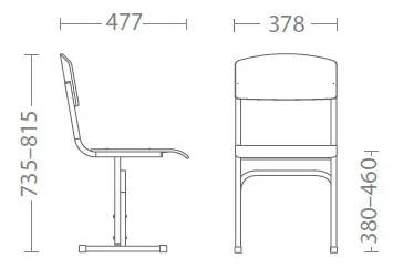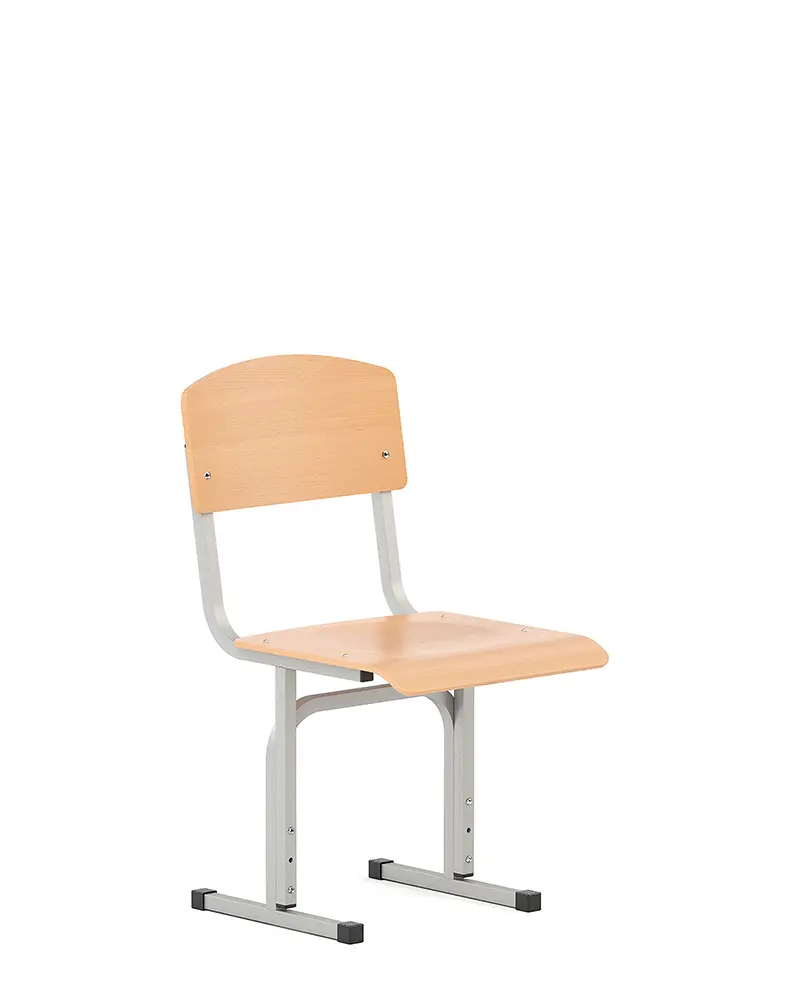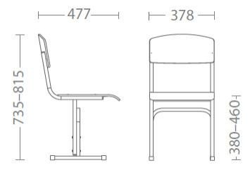 Ученическият стол АНА Е-274  сива рамка притежава механизъм за регулиране на височината в три позиции- 38, 42 и 46 см. Седалката и облегалката са изработени от 7 мм слоест бук. Покритието на цветовете е полимерно прахово  в цветове по RAL.