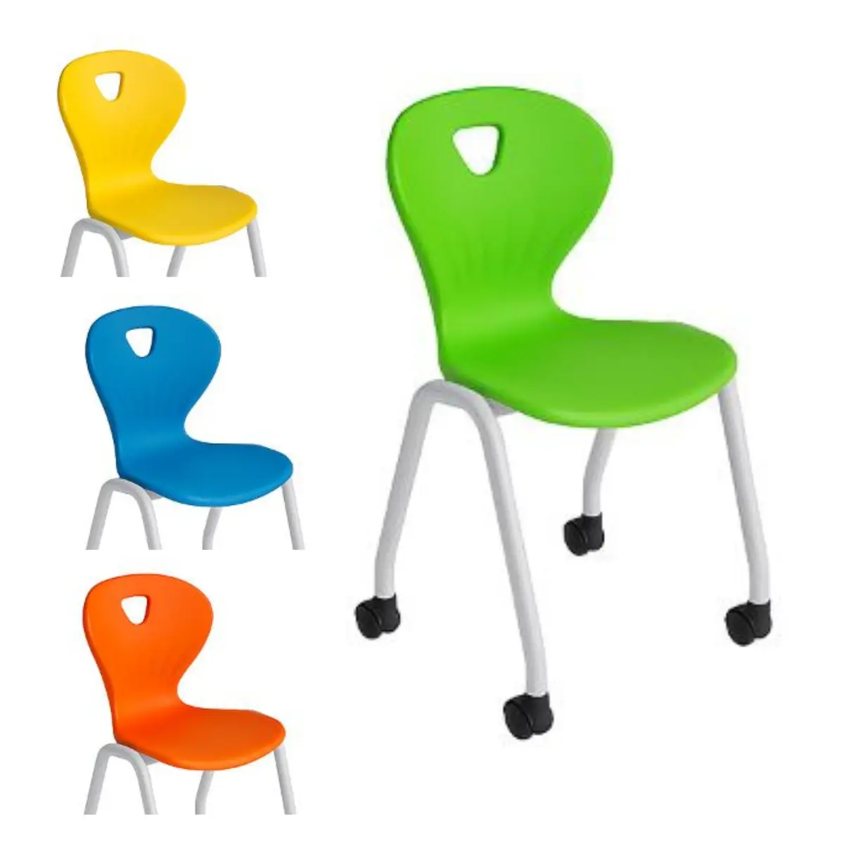 Ученически стол КОРИ М е премиум модел с колелца, отличаващ се с здрава метална основа електростатично прахово боядисване, което осигурява допълнителна издръжливост и елегантна визия.