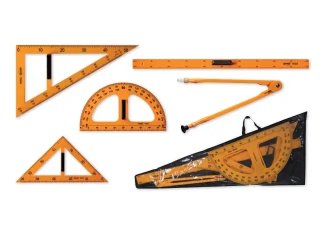 Чертожните инструменти са подходящи за бели или черни дъски. Комплектът съдържа два триъгълника, линия, пергел и транспортир. Произведени са от 100% рециклируеми материали и притежават удобни за работа дръжка.
