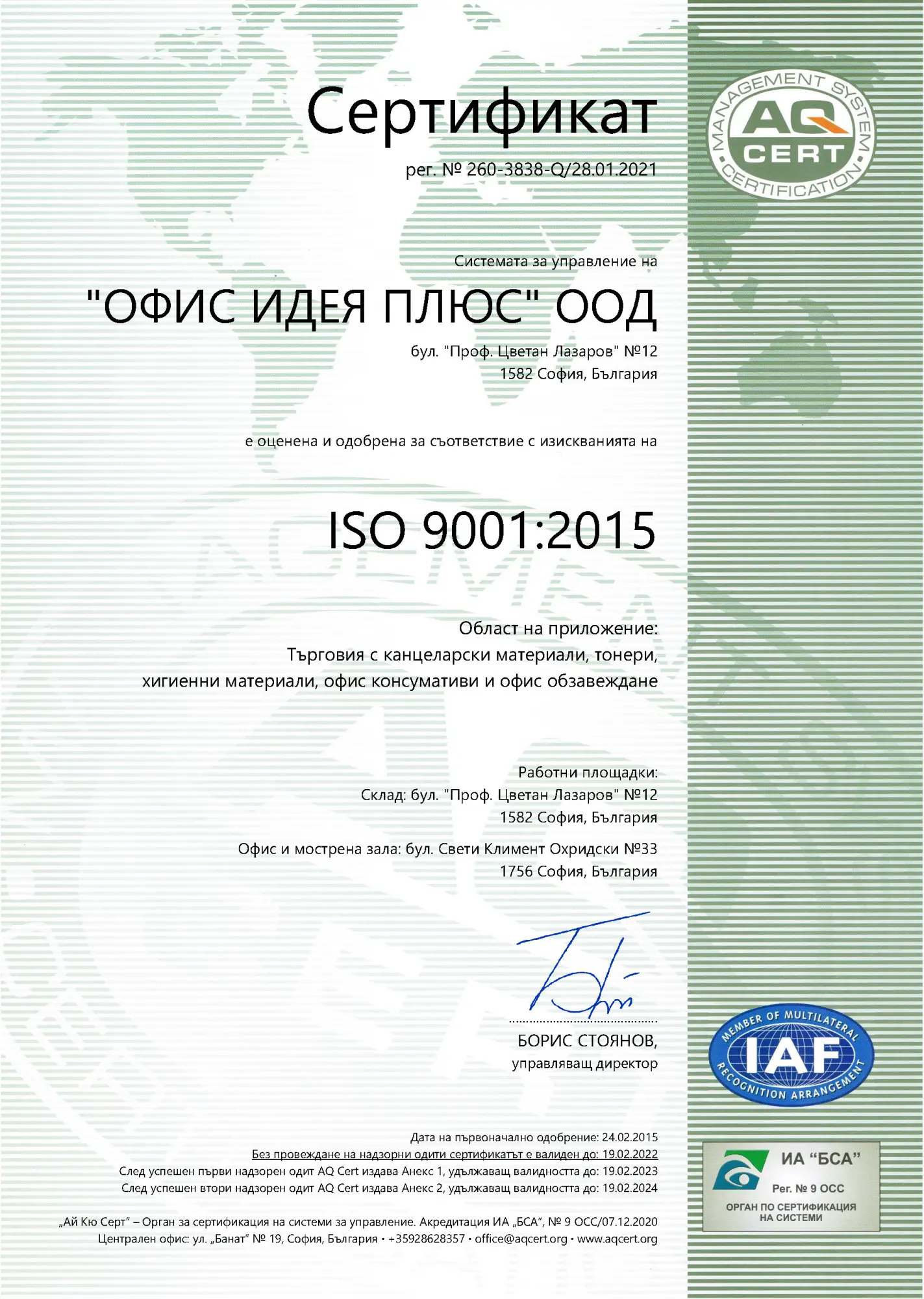 В "ОФИС ИДЕЯ ПЛЮС" ООД е внедрена интегрирана система за управление съгласно изискванията на международните стандарти за управление ISO 9001.