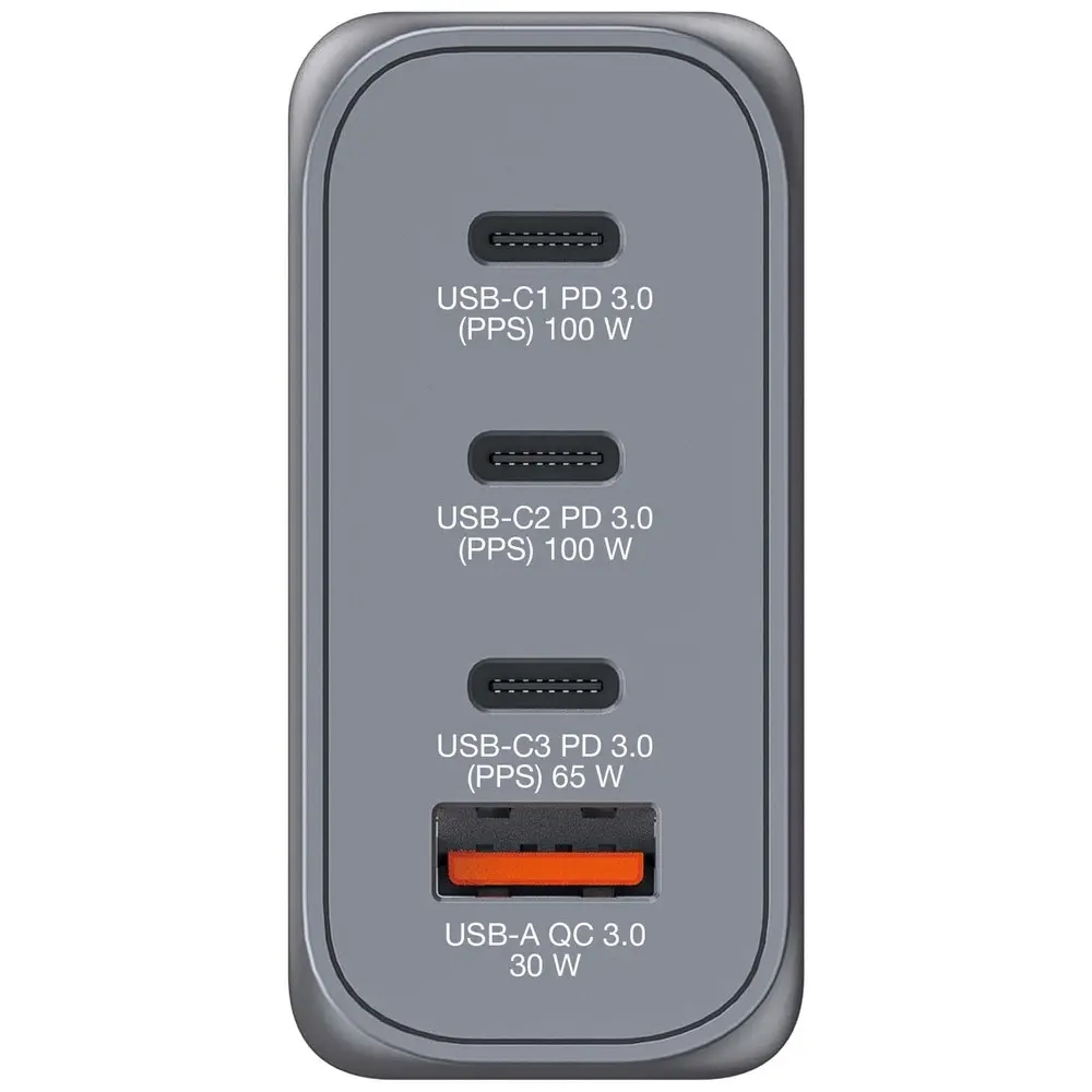 | Мощност, W | Total Output: 100W max, USB-C 1/2 (PPS) Output: Max PD 100W (when used alone) PPS mode Max 45W, USB-C 3 (PPS) Output: Max PD 65W (when used alone) PPS mode Max 45W, USB-A QC 3.0 Output: Max 30W (when used alone) |