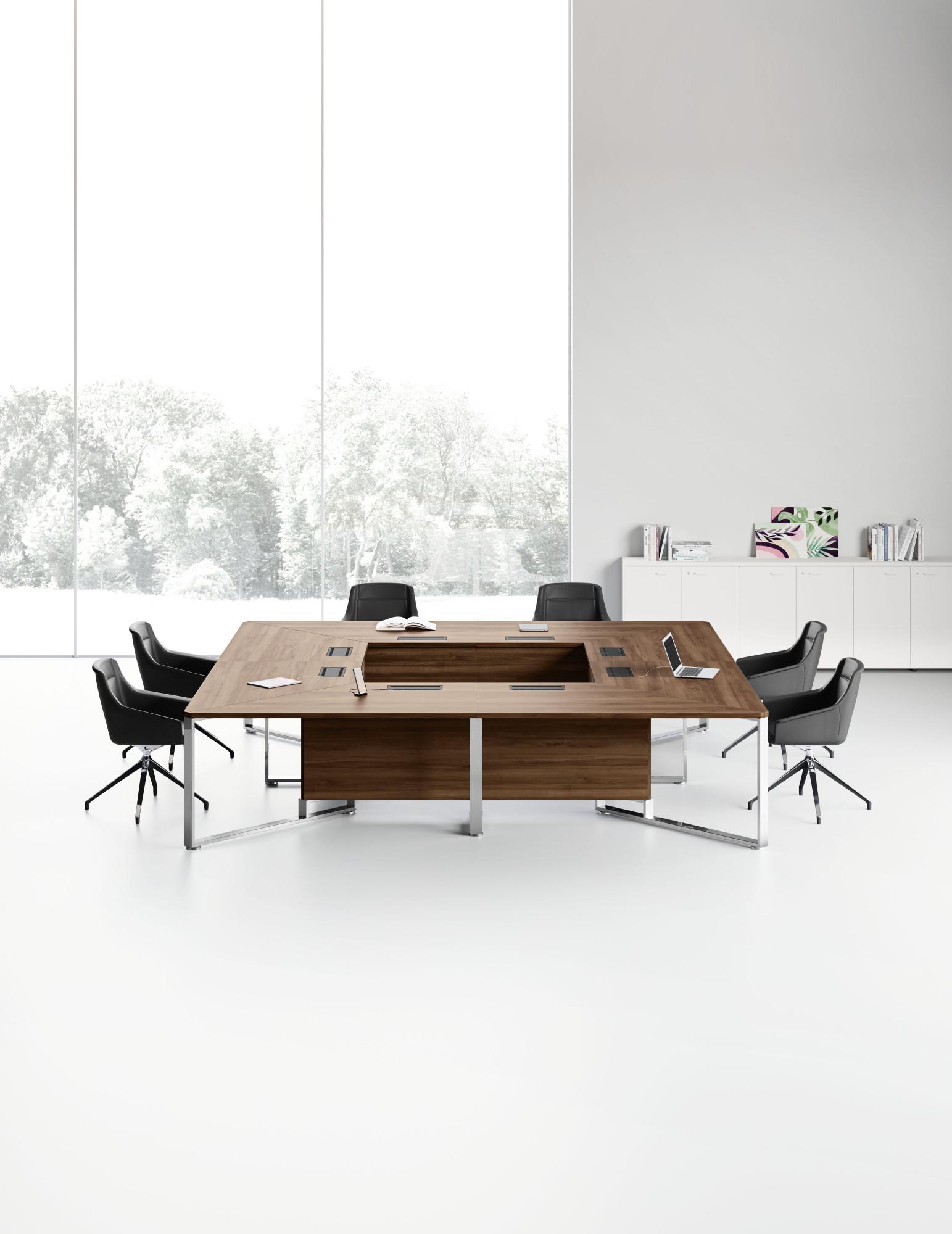 Ясните и строги дизайнерски линии и покрития, модулните форми и раздвижени решения улесняват сътрудничеството и визуалния контакт, правейки конферентните маси I-Meet идеално място за функционални и представителни срещи.