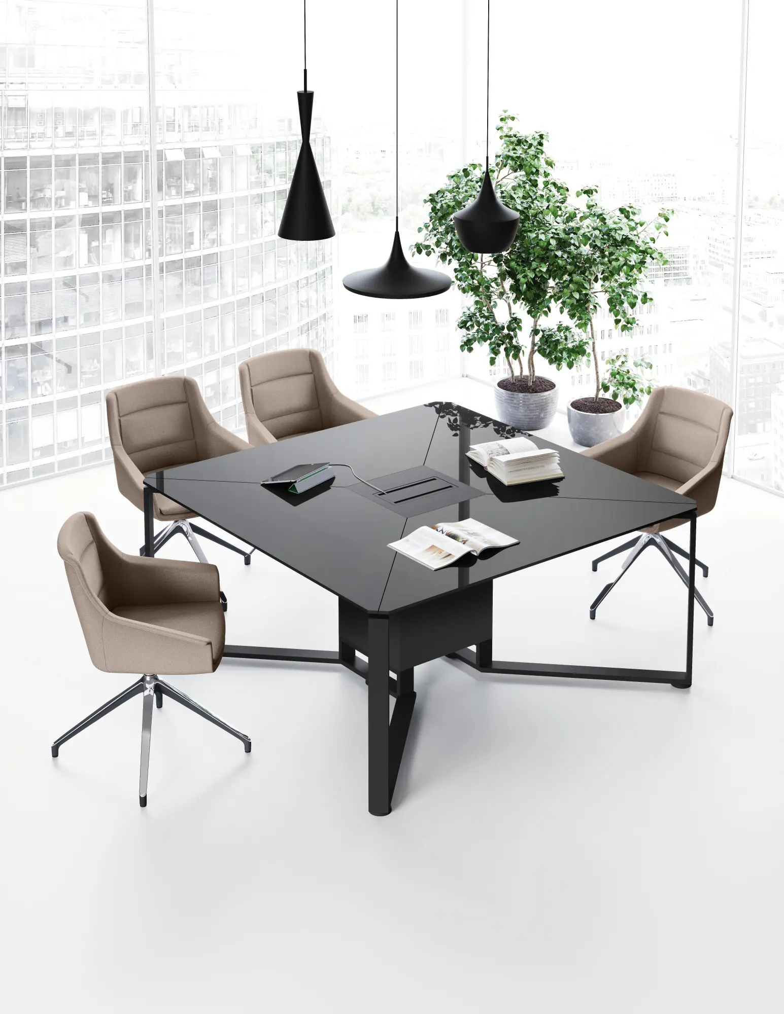 Ясните и строги дизайнерски линии и покрития, модулните форми и раздвижени решения улесняват сътрудничеството и визуалния контакт, правейки конферентните маси I-Meet идеално място за функционални и представителни срещи.
